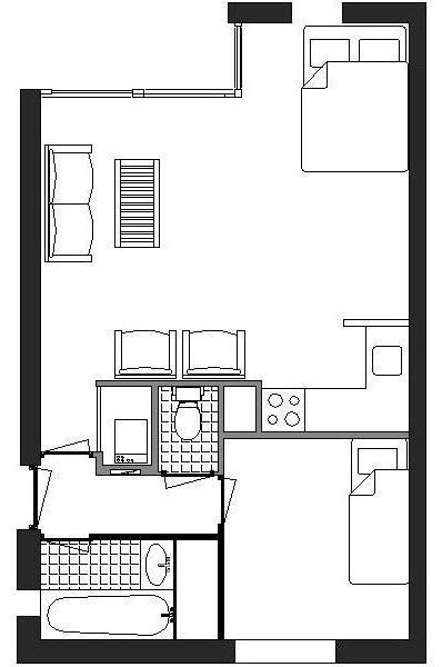 Middels de entree bereikt u de tussengang waaraan de slaapkamer grenst voorzien van een stapelbed en vaste garderobekast.