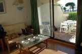 Via de tussendeur bereikt u de woonkamer die gezellig is ingericht en door de hardhouten meubelen met lichte bekleding die Zuid-Franse sfeer uitstralen.